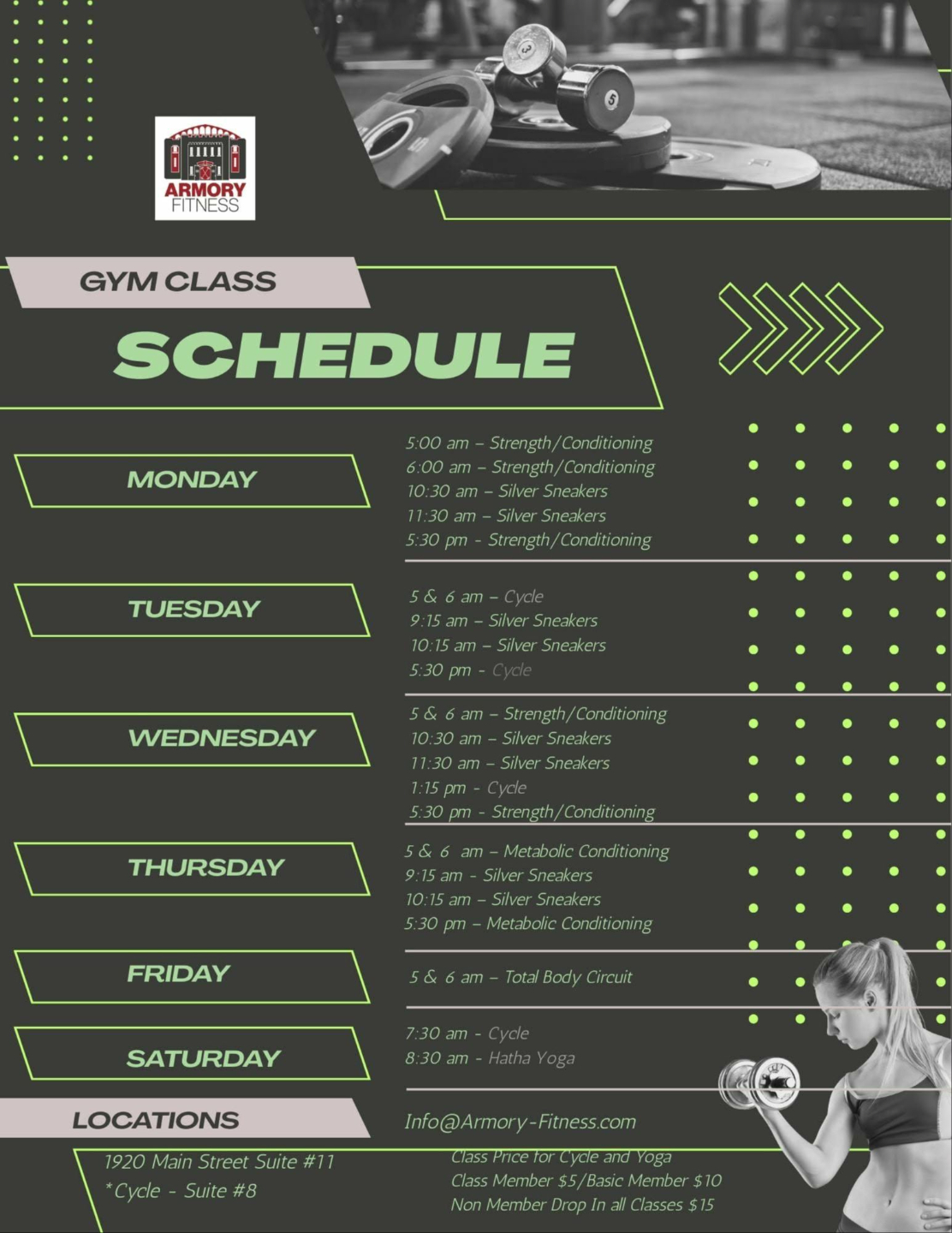 Classes are held at 5:00 AM, 6:00 AM, and 5:30 PM, Monday through Friday. All classes are included for just $75 per month—tax included.